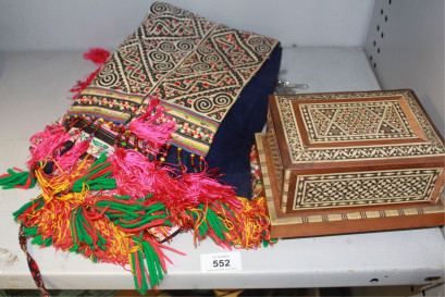 box with hinged lid and 4 trays within, and a pair of ornate Tibetan tribal wedding aprons, intricate hand stitched work, tassles, beads etc -