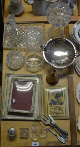 incl. a boudoir lamp, note: no electrics, 2 decorative frames with convex glass, ruby glass and gilt bell, silverplate fruit stand, etc -