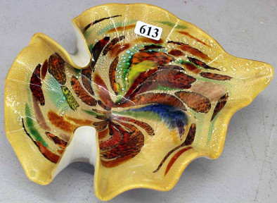 leaf form with Aventurine ''Tutti Fruitti'' / Toso Vetro design. Circa 1950. Length 23cm. -