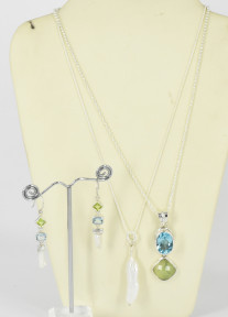 set with keshi pearl or topaz and chalcedony. Together with a pair of drop earrings set with topaz. All on sterling silver. Weight 29g. -