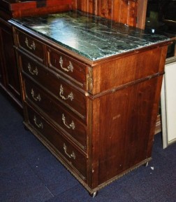 chest, originally 2 short over 3 long graduated drawers, converted to single panel door front, green variegated marble top -