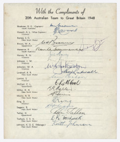 Lot #148 - AUSTRALIA: 1948 Official Team sheet of "The Invincibles" squad to England, led by Bradman and Hassett, with 17 original signatures