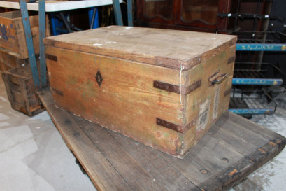 rectangular form, hinged lid, pine construction with heavy duty antique metal lock, side carry handles, metal bound corners etc, 78cm W x 50cm W x 37cm T -