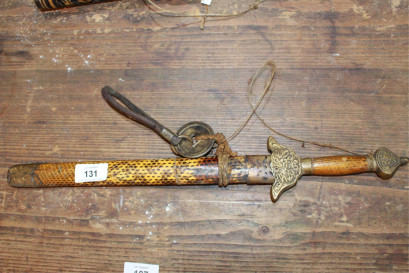 with brass fittings, contained in a scabbard with faux snakeskin detail and a hanging coin style medallion with leather loop, overall length 44cm -