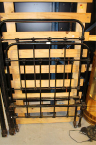 black painted wrought iron, complete with bedhead and rails and wooden slats -