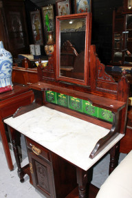 original art nouveau tile splash back, on a white marble slab top, base fitted with one drawer over carved panel door, open shelves to sides, 91cm W -