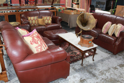 comprising 2 x 3 seater sofas, 1 x 2 seater sofa and 1 x ottoman foot stool, all with studded detail, rolled arms, timber bun feet, note: leather in need of some conditioning but appears sound, -