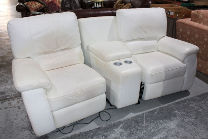 comprising 2 armchairs with central console with cup holders, fitted with electric recliners, comes with power cords etc, in white leather, tested - in working order -