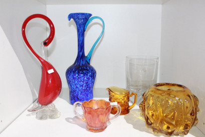 incl a bird ornament, a ewer jug and a glass vase, carnival glass bowl etc -
