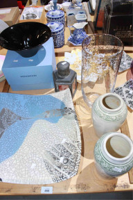a pair of Chinese vases with warriors on horseback, Wedgwood glazed bowl by Nick Munro in original box, a Si-an Italian glass vase with 24ct gold leaf decoration, a Chinese pewter tea caddy with glazed panels and images, character marks to underside and an antique Meissen leaf dish with gilt highlights, minor restoration -