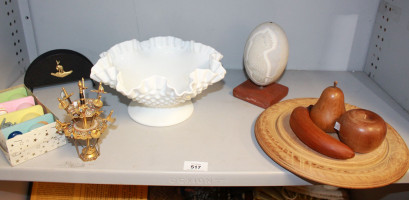 engraved emu egg with cockatoo detail on stand, antique carved wooden bread board, milk glass Fenton bowl, carved wooden fruit, Spanish sword themed cocktail set etc -