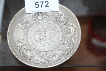 Lot #572 - Chinese white metal dish, dragon detail to rim and