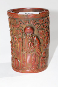 with figure of a wise man holding peach and children, trees etc, signed, 12.5cm T