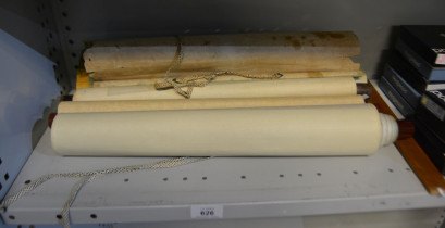scrolls, 5 with ink calligraphy detail, one with a mountain river landscape scene with building and fishing boat on river bank -