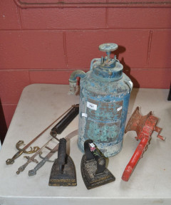 balance scale no. 3, 2 x vintage cast iron irons, a vintage hand held warning siren, 3 x miniature display swords, and a Wormald foam fire extinguisher -