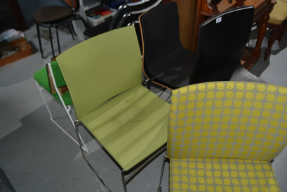 incl. black leather upholstered and black wool etc, various shades of green, flocked wool, plastic, patterned design, contrasting colours incl. some with a wooden Bentwood ply back, one black, one timber with wool and leather upholstery, all retailed by Stylecraft incl. one by Akaba, with laminated ply shell, one by Arpar AAVA model by Antti Kotilainen, polyurethane shell, one with solid black leather hyde upholstery etc -