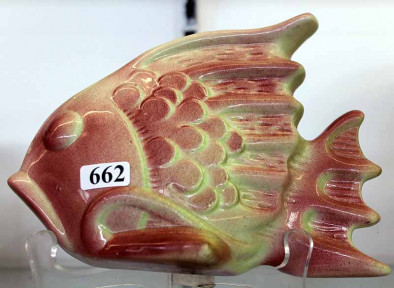 fish form, mint green and burgundy glaze. Circa 1950. Length 20cm. -