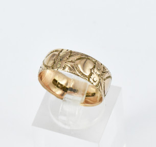 the band well etched with hearts and flowers. stamped 9ct, CYBs, Birmingham 1916. Size P. Weight 3.3g -