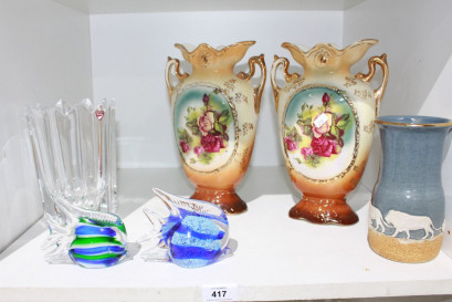 pottery vase with lion design, Orrefors crystal vase and a pair of fish form paperweights with origiinal labels -
