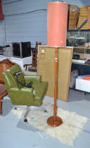 timber standard lamp with pink and gold shade, green upholstered office chair, reclining style on metal base with castors and a shag pile rug, 130 x 70cm -