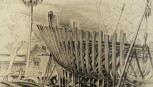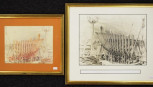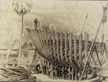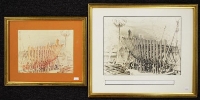 including 'Skeleton of Wooden Freighter, Boyd's Yard, Lake Macquarie,' pencil on paper, signed lower left, (24cm X 32cm approx); and Boyd's Yard, Lake Macquarie, coloured pencil on paper, unsigned, (18cm X 23.5cm approx). (2) -