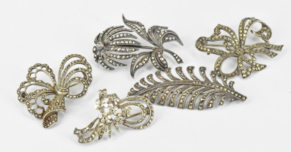shaped as bow or leaves and flowers, all set with marcasites on silver. Weight 42.4g -
