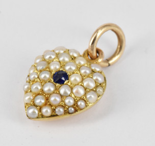 shaped as a heart, set with seed pearls and synthetic sapphire, in 15ct yellow gold. Weight 2.4g -