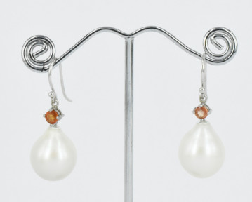 pear shaped cultured pearls surmounted by orange tourmaline, on 9ct white gold hooks. -