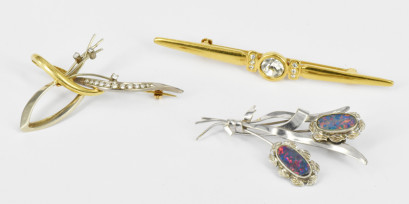two stone opal doublet and 9ct white gold spray brooch (5.9g), a diamond and 18ct gold spray brooch with 14 diamonds (5.1g), and a metal brooch. (3) -