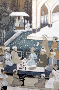 depicting a Sultan and his advisers. 86 x 58cm. Framed. -
