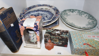 serving dishes incl. oriental, plus boxed oriental items incl. miniature terracotta warriors, stress balls, a Kimmi doll - still boxed, an old Longfellow Book, a snuff bottle -