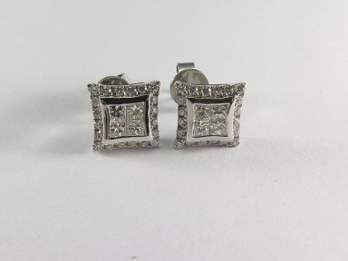 each with four princess cut diamonds in a shaped border of twenty brilliant cut diamonds; 18ct white gold. -