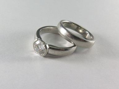 brilliant cut diamond set in platinum, with a matching platinum band ring. Estimated weight of diamond 0.95ct graded in the setting as Colour F, Clarity SI1. Size L. (2) Total weight 14.2g. -
