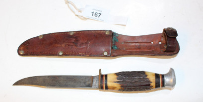 small size made by Widder, Solingen, blade engraved 'extra hollow ground', various maker's stamps etc, horn handle with aluminium pommel and brass guard, blade length 13.2cm, overall 23.7cm, comes with original leather scabbard with stag detail -