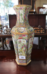 Lot Description:Chinese hexagonal vase decorated with panels of birds and flowers on a polychrome floral ground