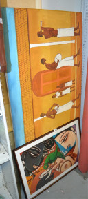 tribal musician scene - unframed and unsigned 75 x 150cm together with a framed surealist print by George Keyt -