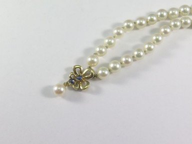 5mm Akoya pearls of good lustre string with a 14ct gold clasp marked Mikimoto with a sapphire and 14ct gold pendant. (Mikimoto box) -
