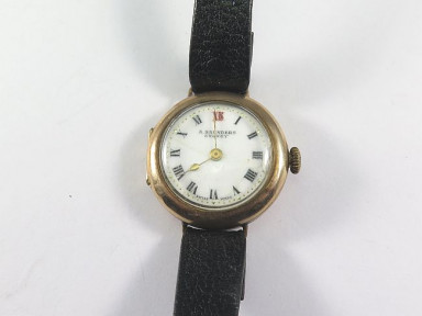 with round case, Roman numeral enamel dial and Swiss lever movement; leather strap; the dial marked for A.Saunders, Sydney. -