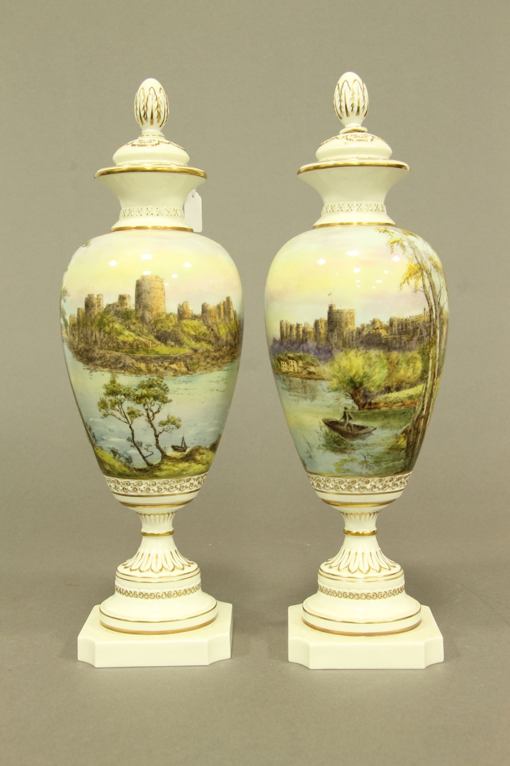 of urn vase form with hand painted 'Pembroke' and 'Windsor' castle scenes by P. Love. Marks for 1955.