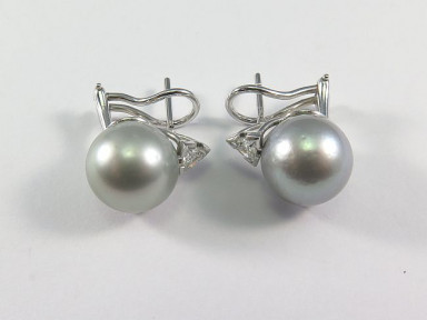 each a silver grey black cultured pearl (12mm) with good lustre set in 18ct white gold and each set with a trilliant cut diamond. Estimated weight of diamonds 2 = 0.30ct. -
