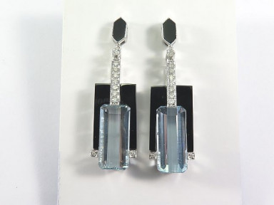 each with a long emerald-cut aquamarine on an onyx and diamond plaque with hexagonal onyx top; 18ct white gold with post and scroll fittings. Estimated weights: Aquamarines 2 = 16.23ct, Diamonds 20 = 0.50ct. -