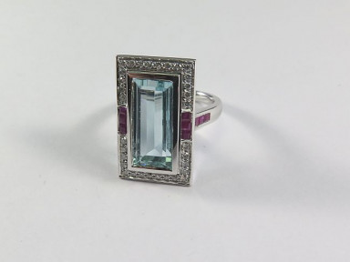 Lot Description:An Art Deco Style Aquamarine, Ruby and Diamond Dress Ring
