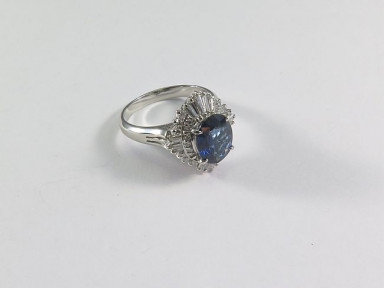 oval sapphire four-claw set within sixteen baguette cut diamonds and twenty-six brilliant cut diamonds; platinum. Estimated weights: Sapphire = 1.83ct, Diamonds 42 = 0.62ct. Weight 6.3g. Size K1/2. -