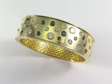 the wide bangle (17.5mm) set with eighteen brilliant cut black diamonds and twenty brilliant cut diamonds. Estimated weight of largest two diamonds each 0.55ct. Estimated total weight of diamonds 18 = 1.75ct, 20 = 2.60ct. Weight 98.3g. -