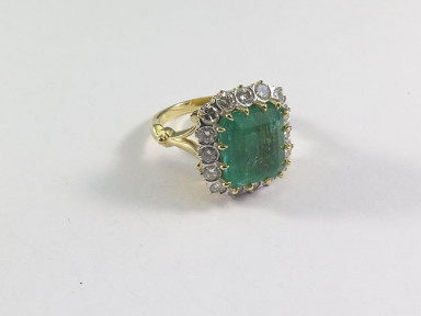 emerald-cut emerald multi-claw set within a border of sixteen brilliant cut diamonds; 18ct yellow gold. Estimated weights: Emerald = 6.36ct, Diamonds 16 = 1.10ct. Size M. -