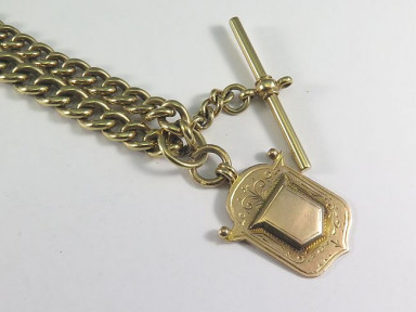 curb-pattern chain with running chain, 'T'-bar, two swivels and shield fob medallion. Length 51.5cm. Weight 56.8g. -