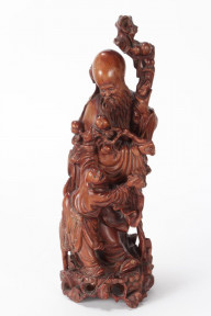 depicting an immortal holding a branch with peaches, with young child and crane at his side, a/f, h 36cm -