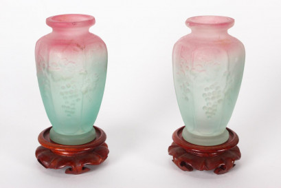 of ovoid form, decorated with flowers, in tones of pink and green, set on wooden stands, h 12cm -