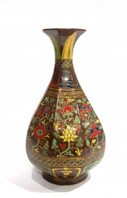Lot Description:A Pear Shaped Vase, Yuhuchun, with Octagonal Facets, the Brown Ground Enamelled with Large Yellow & Red Blooms