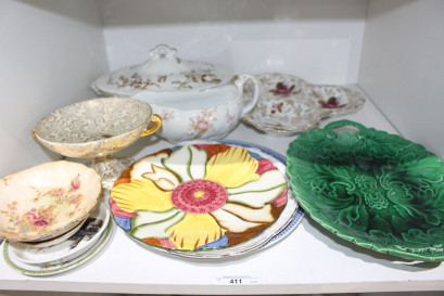 Majolica double handled green leaf plate, a wood colourful leaf plate, Royal Adderley cake plate, old Sydney display plate, lidded tourine etc -